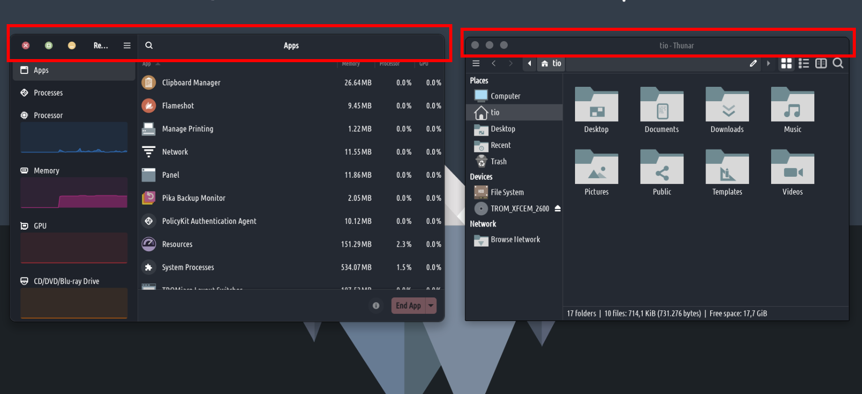 Left is Resources (a task manager app) and right is Thunar (the default file manager for XFCE):